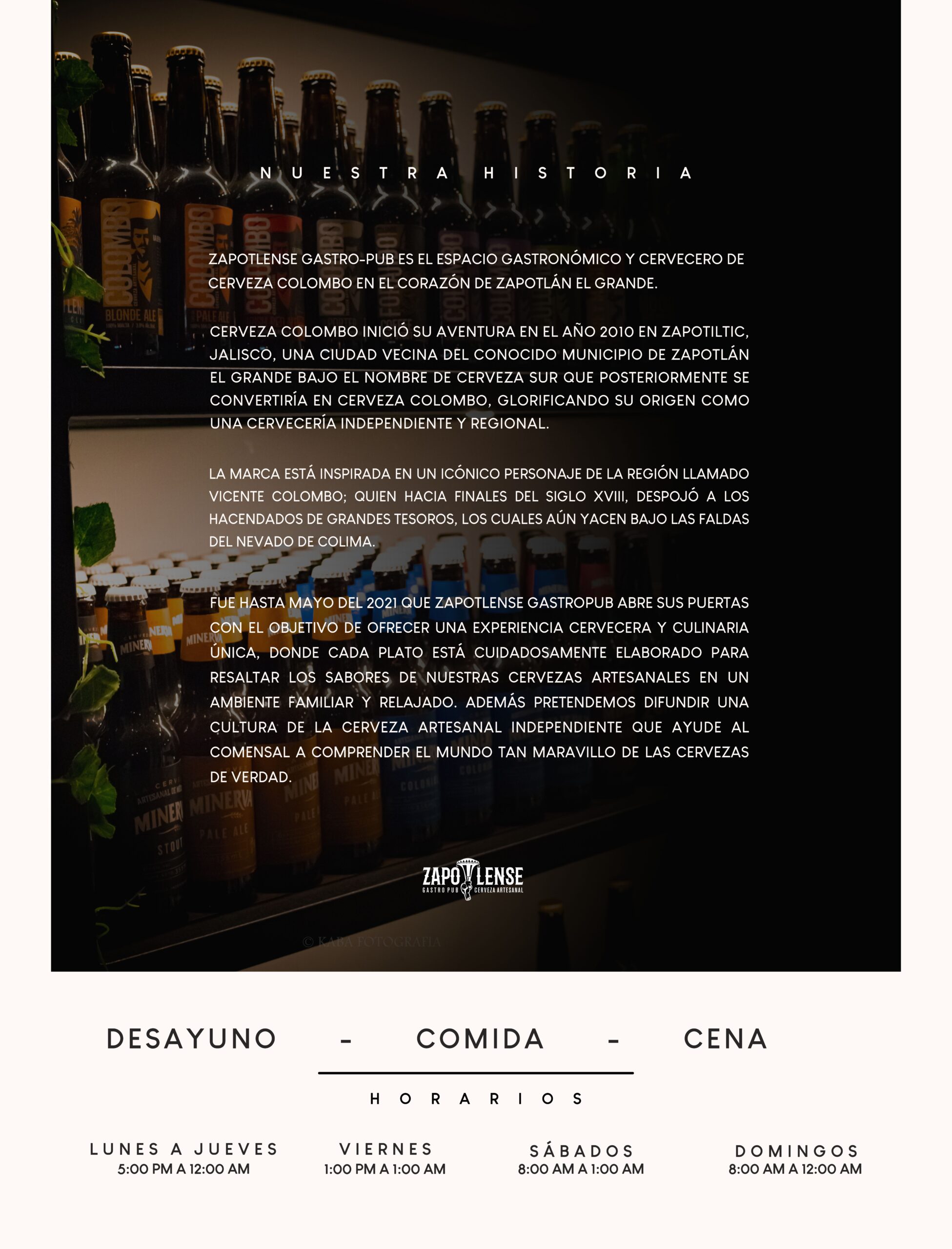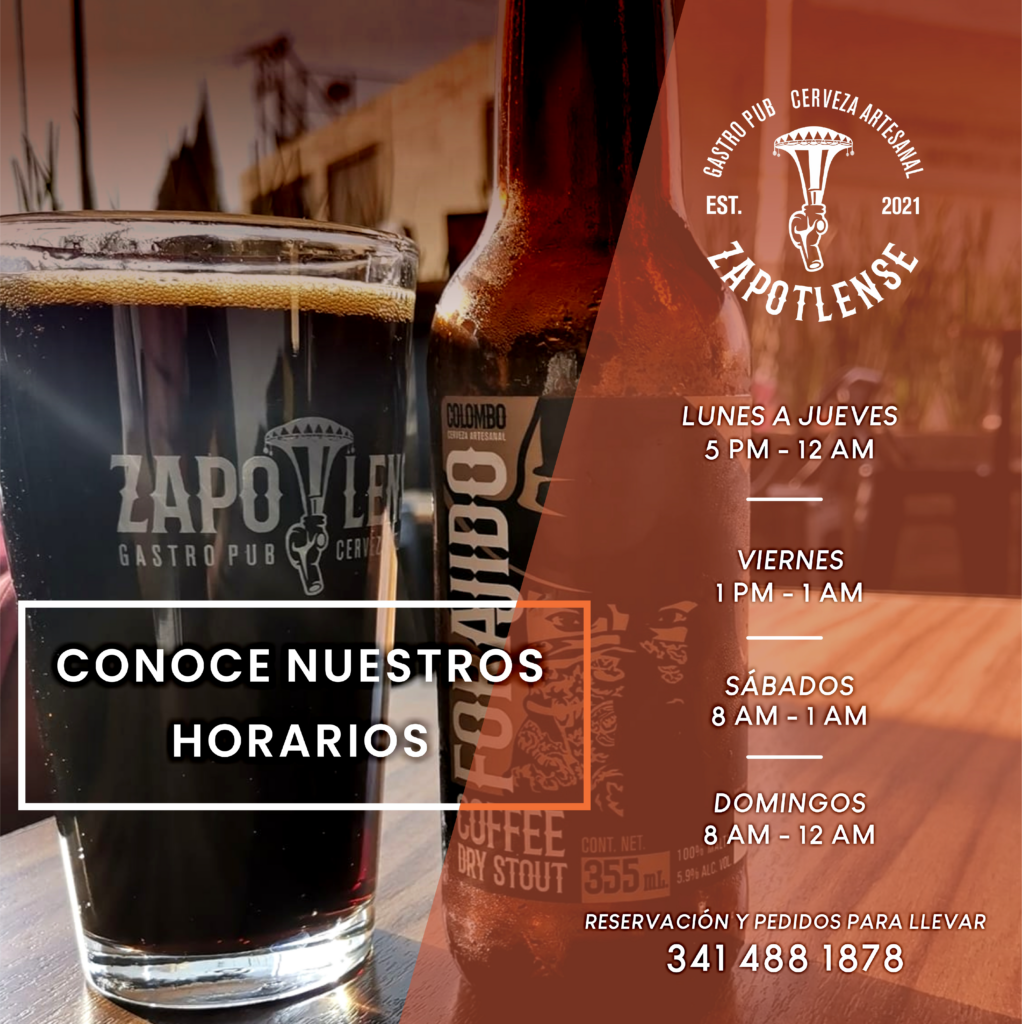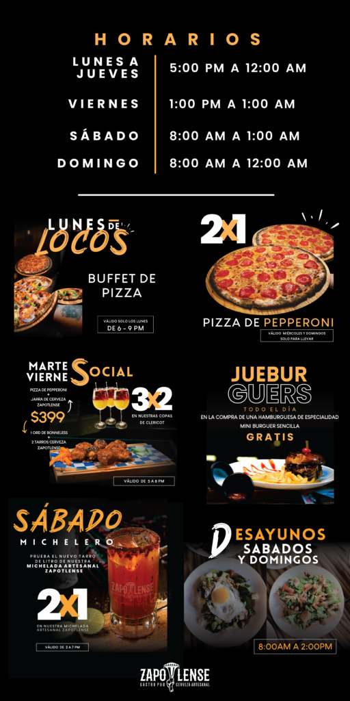 Zapotlense 102. Pizzas03. Burgers04. Platillos en general05. Cerveza de barril_07. Horarios, contacto, direcciónWhatsApp Image 2024-09-06 at 11.34.48 AM Consulta Nuestras Promociones Lunes Martes Miércoles Jueves Viernes Sábado Domingo Nuestro Primer Aniversario